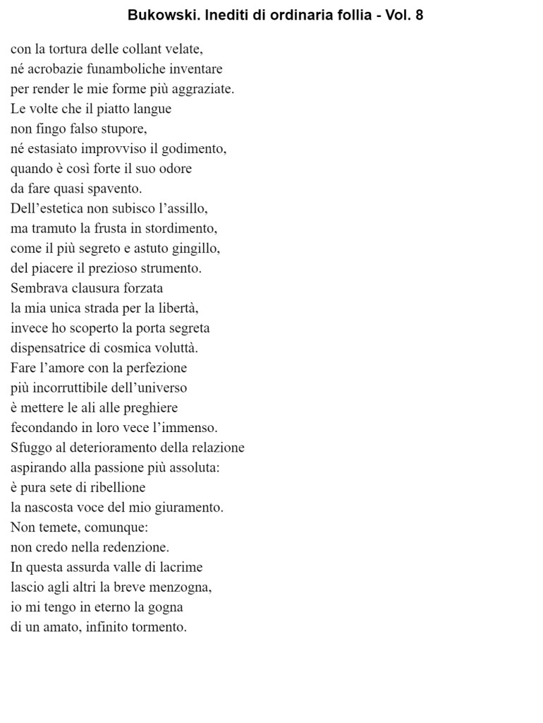 Ma lui sembrava non voler sentire e, a parte qualche decoroso avanzo di galera, a letto particolarmente focoso, con gli uomini normali l’argomento si è rivelato quasi sempre deludente, e oltretutto frettoloso. Tutto il resto era assolutamente noia. Storie di ordinaria routine, piccolo-borghese e senza gioia.