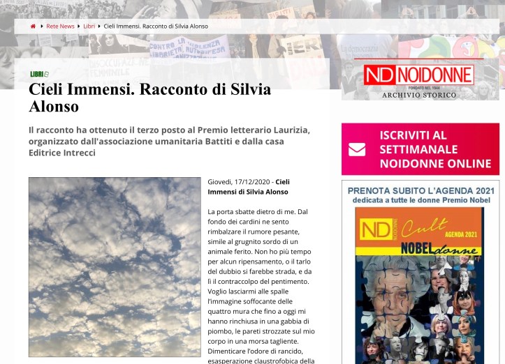 Cieli Immensi, terzo classificato lo scorso anno al Premio Letterario al femminile Laurizia, (25.11.2020) e successivamente pubblicato sul settimanale online Noi Donne🤞🏼🤩🙌🏻