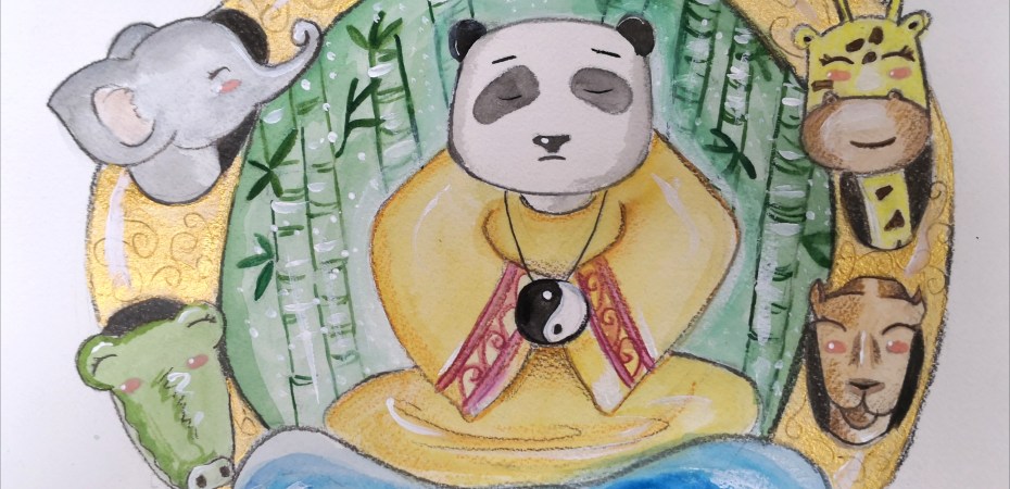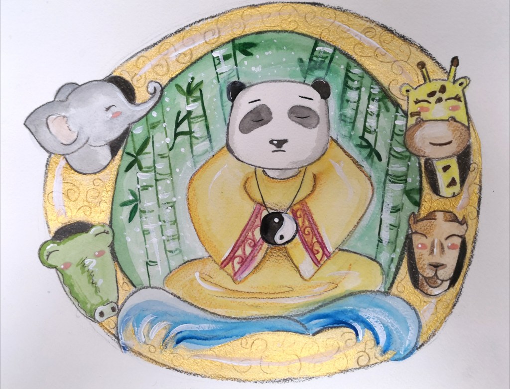 Trovare la dimora del saggio panda non fu però un’impresa semplice, perchè quegli orsetti si trovavano un po’ ovunque nella foresta, intenti a placare il grande appetito con i cuori del bambù, a rifarsi i denti sui tronchi, a dormicchiare accoccolati alle radici degli alberi o sulla sommità di grandi rocce. Fu per un puro colpo di fortuna che, dopo un lungo girovagare senza meta, i quattro amici trovarono infine una piccola grotta all’interno della quale, proprio lì di spalle, seduto a schiena eretta e le zampe incrociate, trovarono il saggio panda. Aveva un aspetto maestoso, sebbene potessero vederlo solo di schiena.