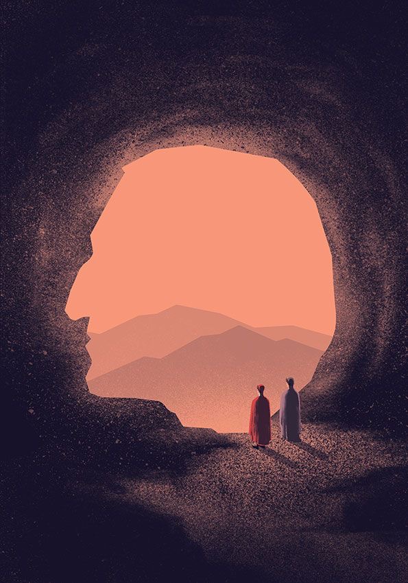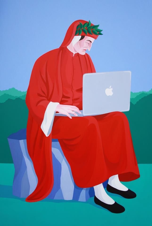 Non faccio in tempo a seguire il richiudersi della schermata dietro all’orizzonte della dura pietra, che dinanzi a me vedo proiettarsi la sagoma del Sommo Poeta. Un balzo mi sale al cuore, lesto ne attiro a me lo sguardo mostrandogli il viso, quando mi avvedo che è solo un’icona priva di colore, una presenza sottile che mi si affianca mite con la funzione di mero consigliere, discreto più di un silenzioso Vate.