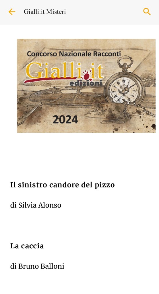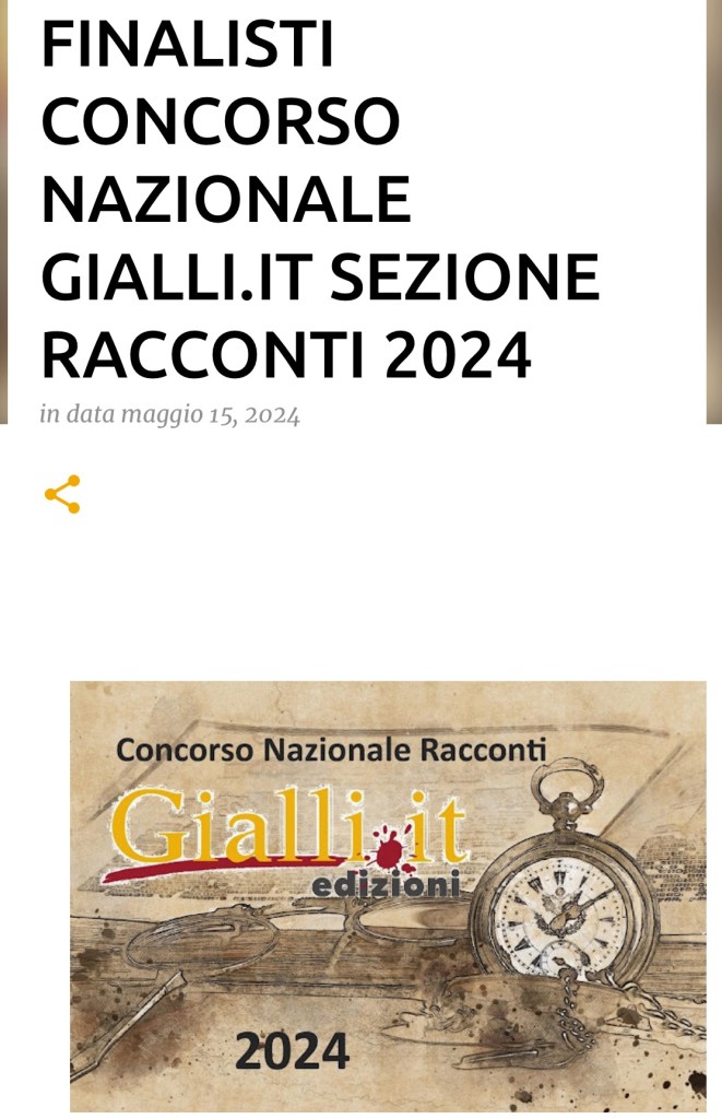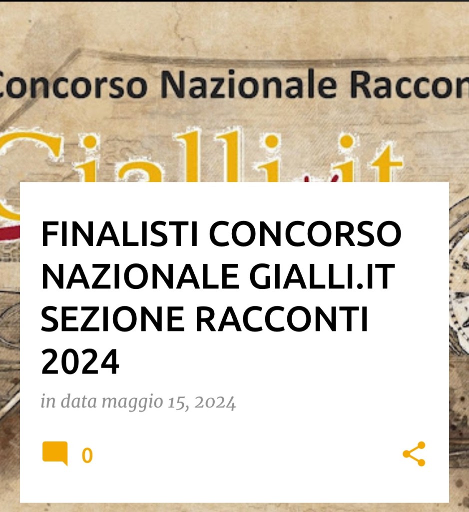 16 Maggio 2024 Silvia Alonso Finale a Giallo.it- Giallo di Napoli ! https://giallipuntoit.blogspot.com/2024/05/finalisti-concorso-nazionale-gialliit.html?fbclid=IwZXh0bgNhZW0CMTEAAR2xmzn2KdpvapHoGycsCX6qA8G2IF96Itwv7d9XnZBjYOTl4gLoiXNAxA0_aem_Ab2SoWxdb_pel-rnV_l0n0KJ9gOhMoBvNoDsIB0a-JxwDpq0E5H32kpsmvyC7Sy8RL1HwAzxrZigF9uUqYn0_0DR&m=1 Condividi: Fai clic per condividere su WhatsApp (Si apre in una nuova finestra) WhatsApp Fai clic per condividere su Facebook (Si apre in una nuova finestra) Facebook Fai clic per condividere su X (Si apre in una nuova finestra) X Fai clic qui per condividere su LinkedIn (Si apre in una nuova finestra) LinkedIn Fai clic per inviare un link a un amico via e-mail (Si apre in una nuova finestra) E-mail Mi piace Caricamento... Correlati